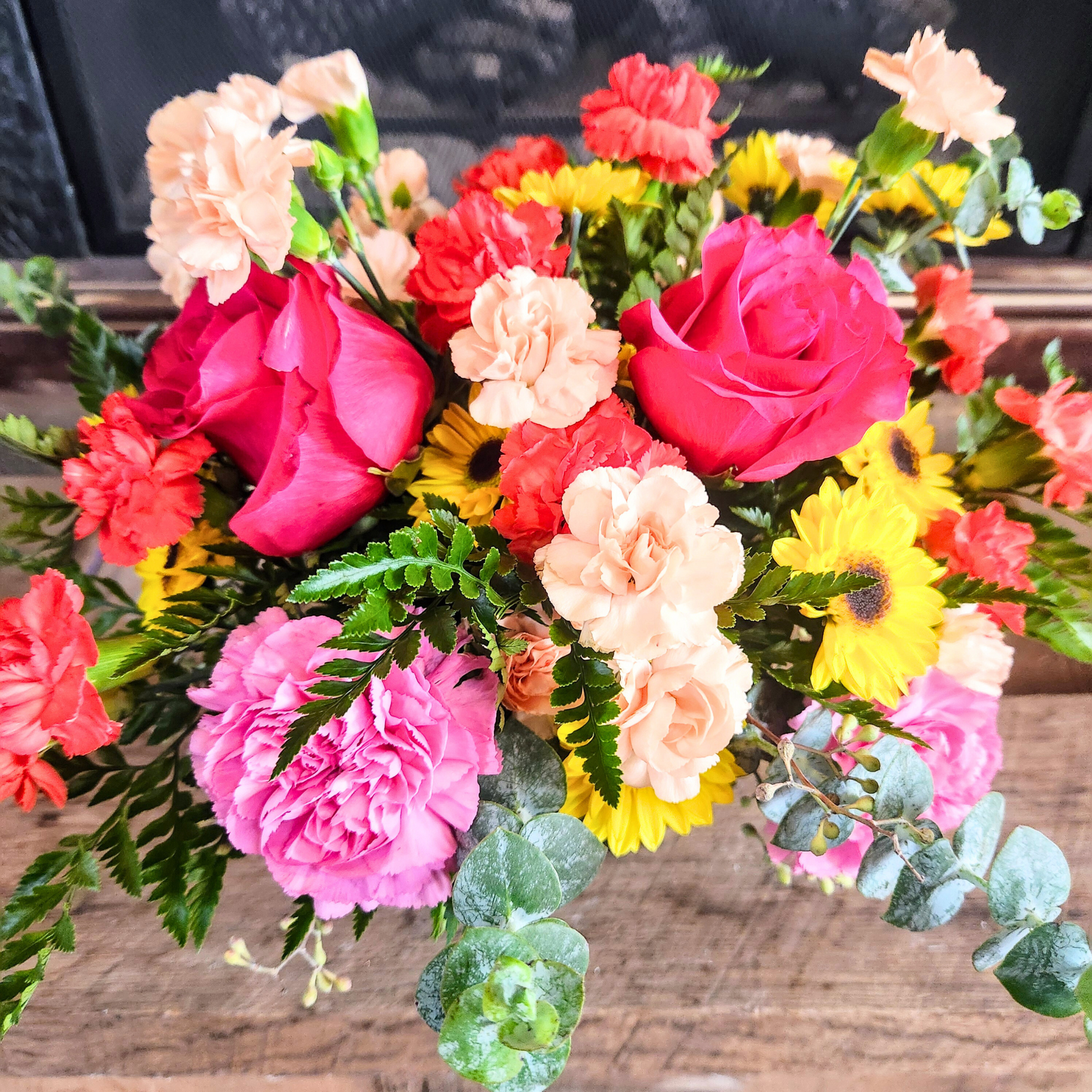 "Floral Delight" is a charming, compact bouquet that brings a burst of color and cheer to any space. Standing approximately 8+ inches tall, this delightful arrangement is filled with a vibrant mix of flowers, including spray roses, carnations, mini carnations, daisies, and solidago. Each bouquet is unique, with a delightful mix of bright and cheerful colors. The arrangement is presented in a 4-inch tall glass vase, making it a perfect size for a desk, side table, or any space that needs a touch of floral joy.