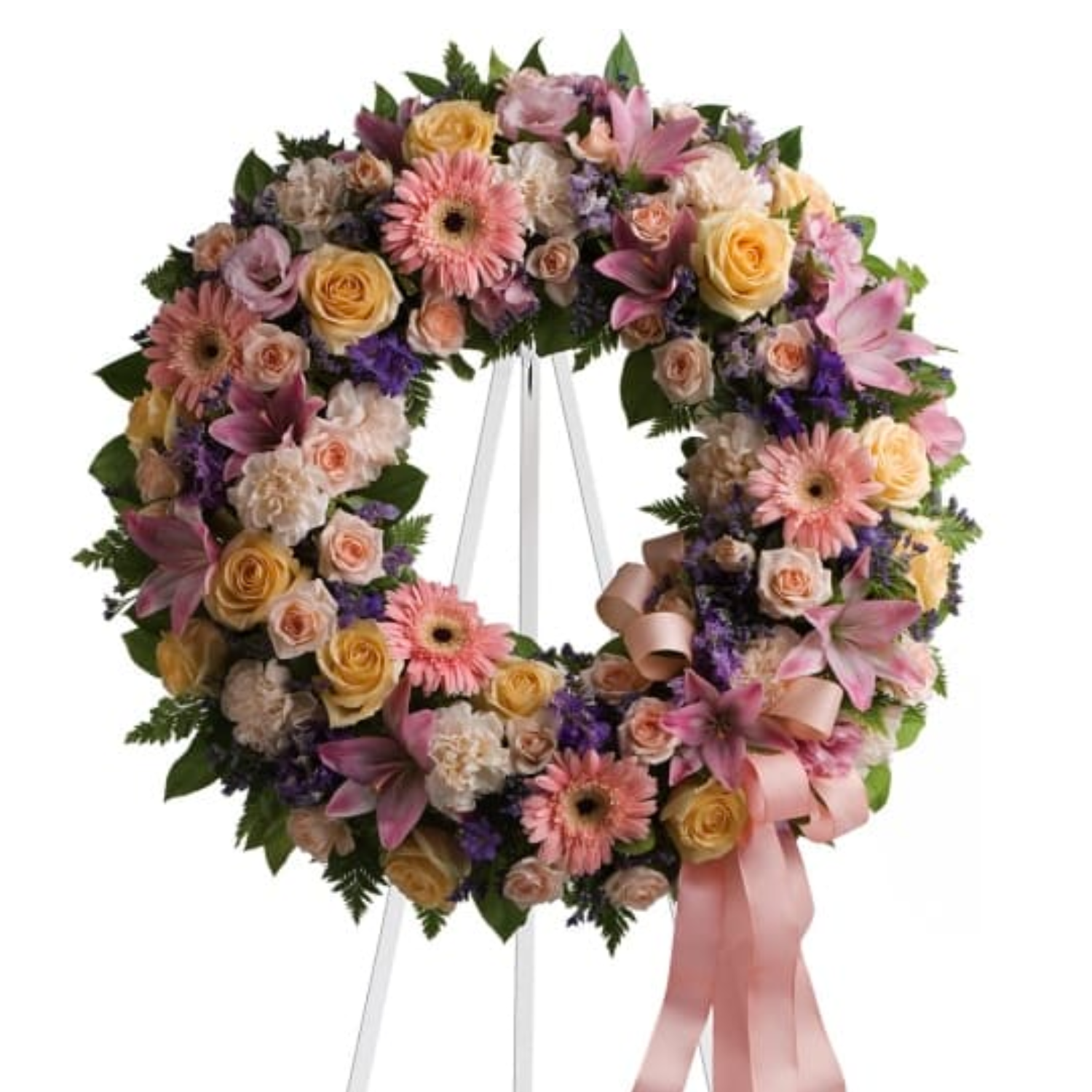 The Graceful wreath is composed of yellow, pink, and purple flowers, artfully arranged in a circular design. Express your sympathies with this elegant and tasteful design, perfect for memorials and other occasions.