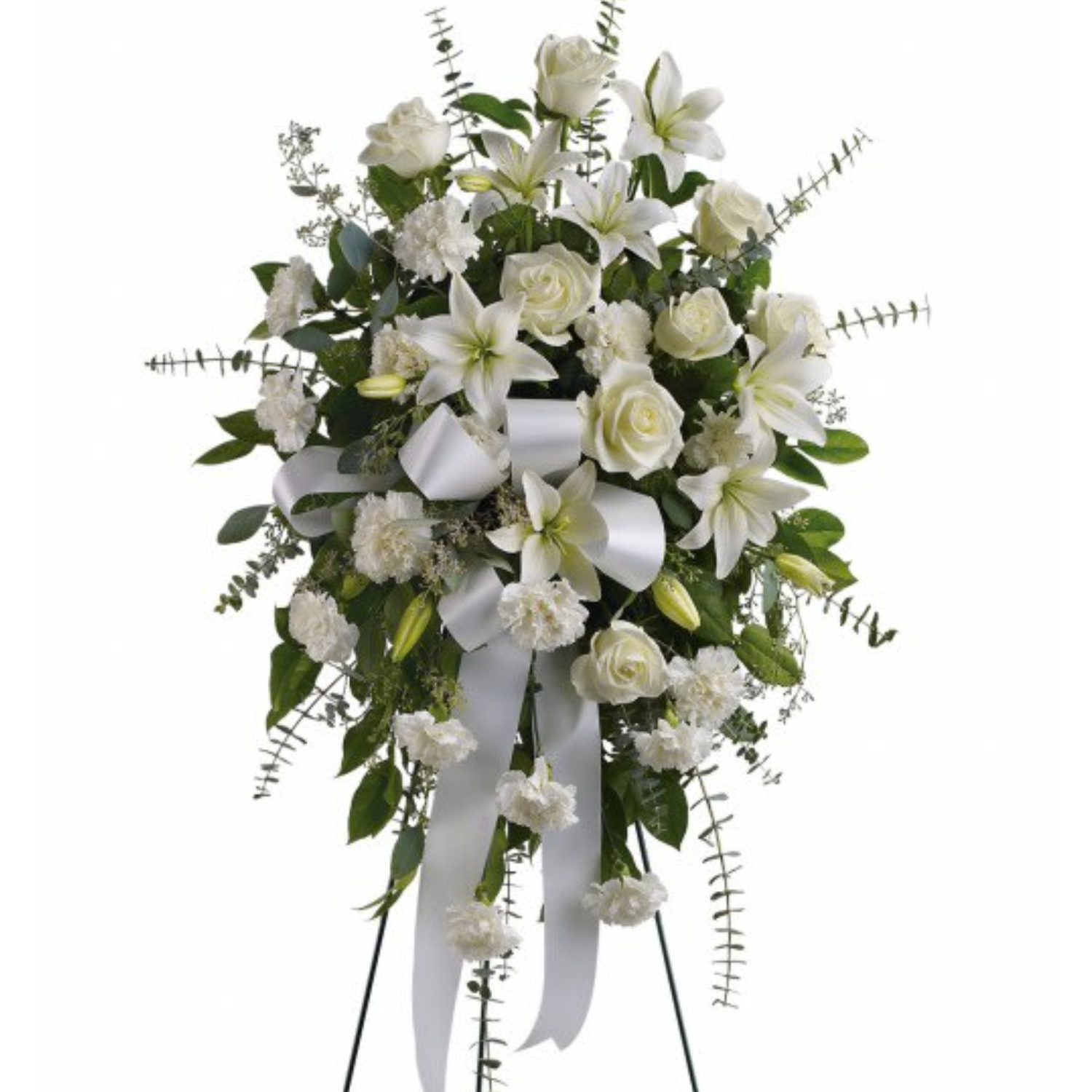This standing spray, in elegant white and soothing greens, will serve as a beautiful tribute to someone who brought love and peace to those around them.