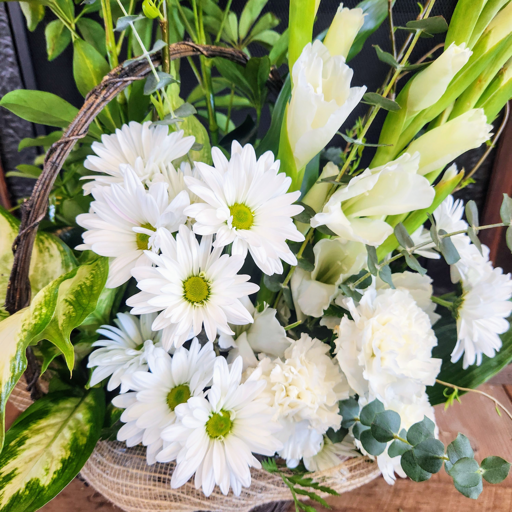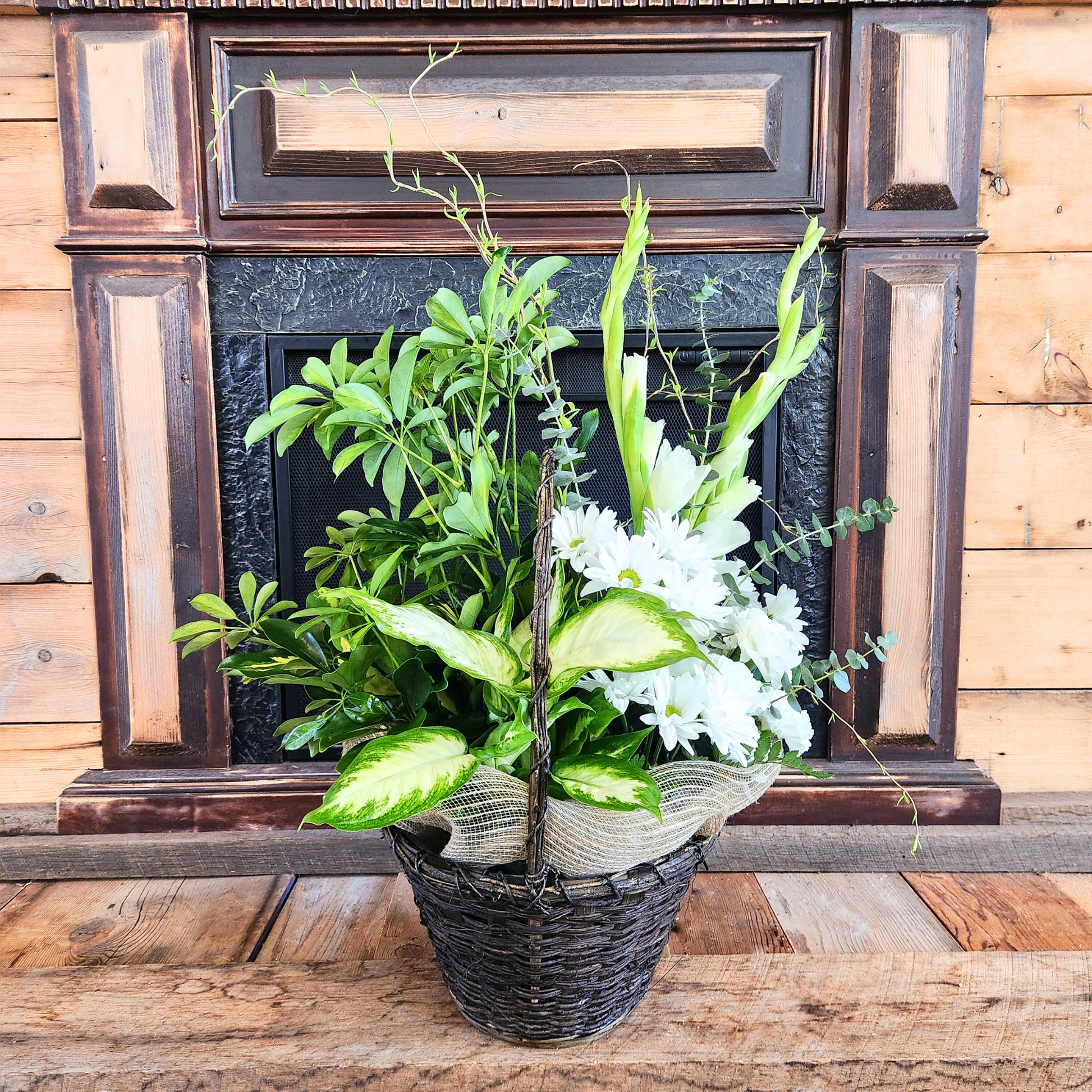 Find solace and comfort in 'The Comfort Garden,' a serene sympathy arrangement designed to bring peace and tranquility. This elegant display, reaching approximately 24 inches in height and width, features a 12-inch basket overflowing with a harmonious blend of white flowers, complemented by delicate touches of accent colors. Two lush green plants, a 6-inch and a 4-inch, are carefully placed within, adding a touch of life and resilience.