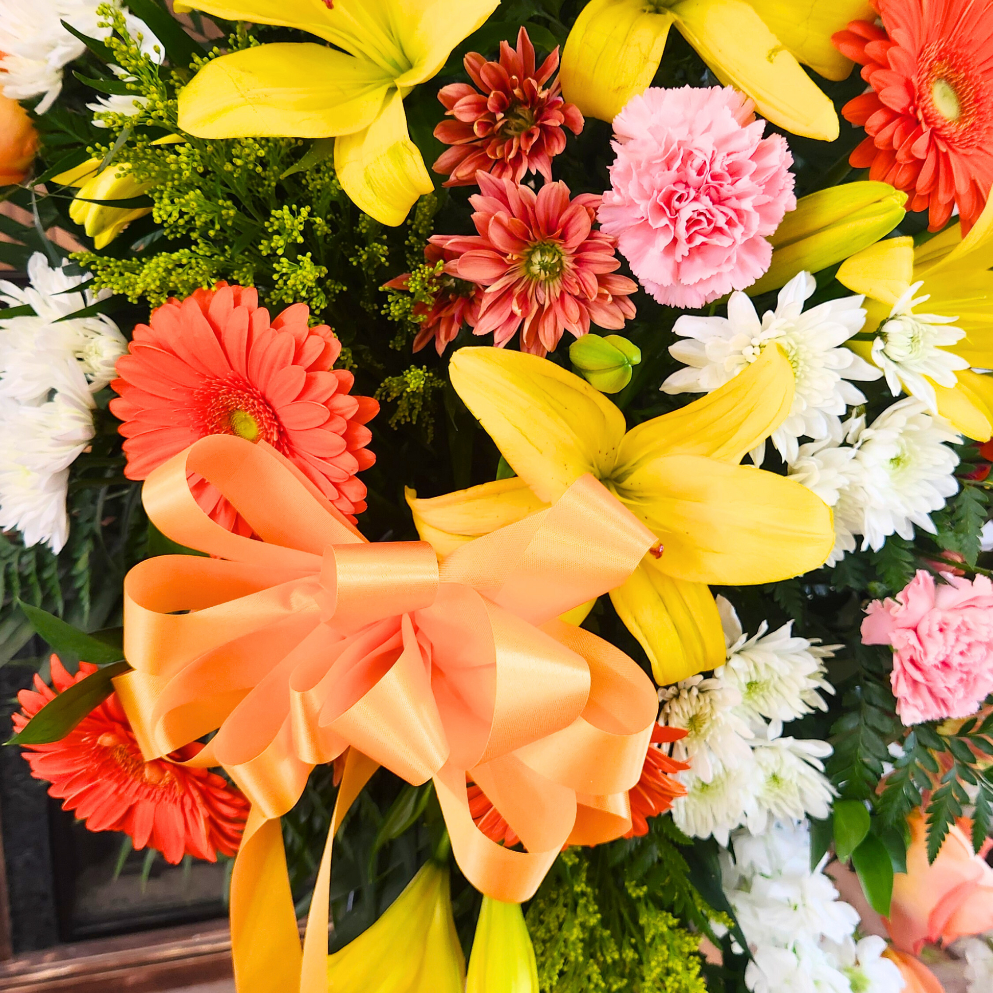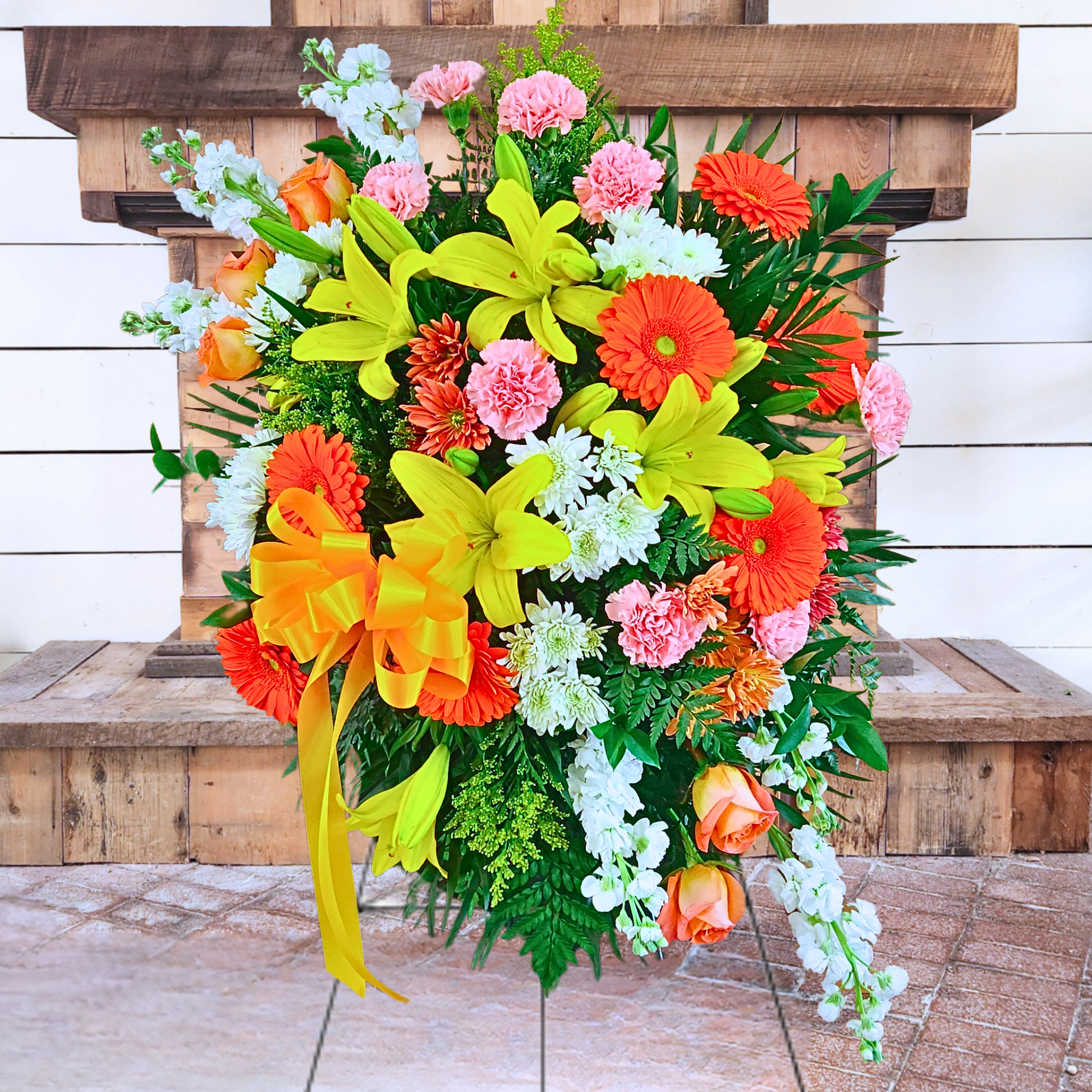The Treasured Lilies Standing Spray is a colorful and supportive symbol of sympathy. The design features an abundance of lilies and enhances any memorial service. This arrangement is carefully arranged to create a fitting tribute to honor a loved one.